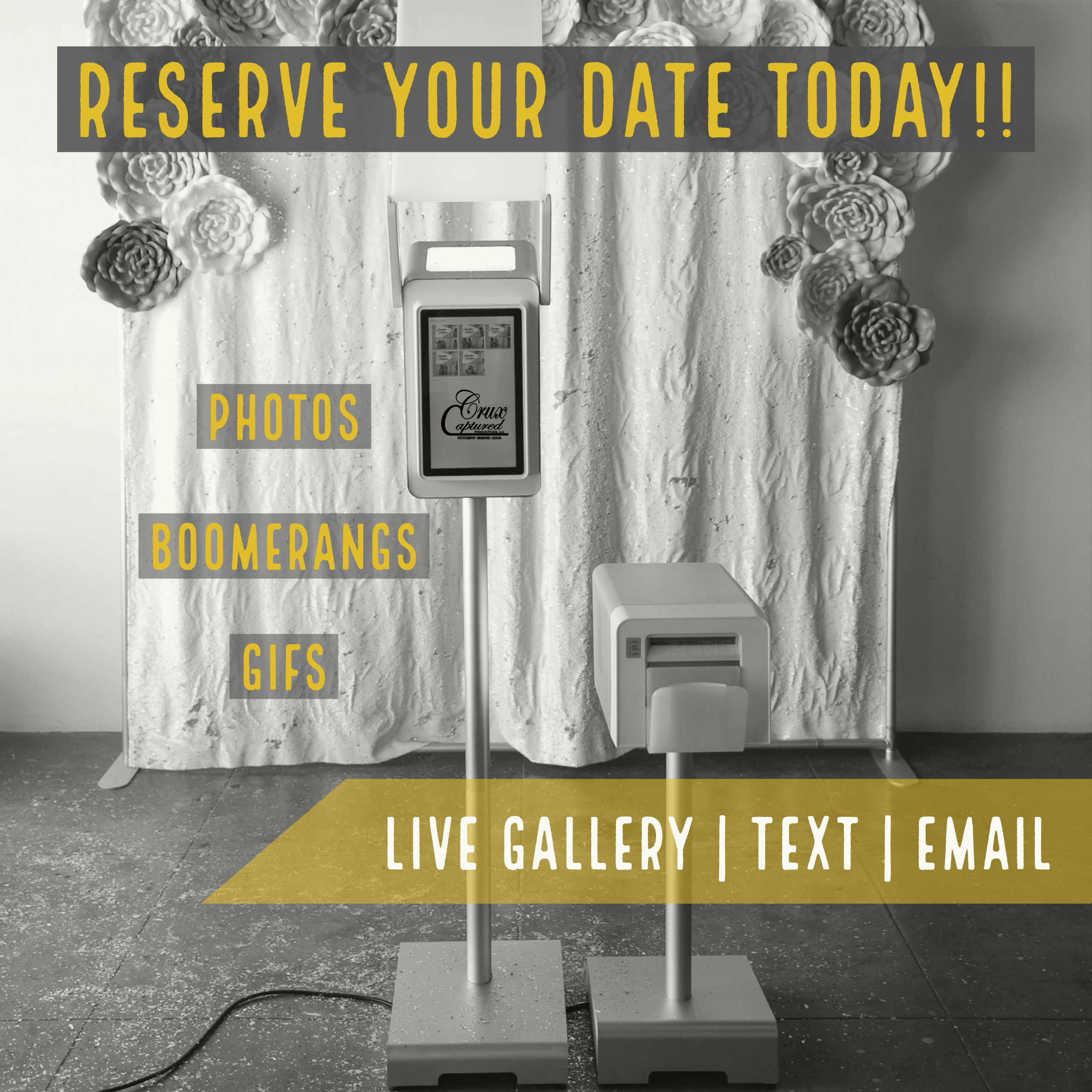 Contact us at Cruxcaptured@gmail.com to be sure your date is available then Reserve The Crux Captured photo booth for your next celebration by submitting a deposit. We’ll follow up with an email to customize all the details of your event.